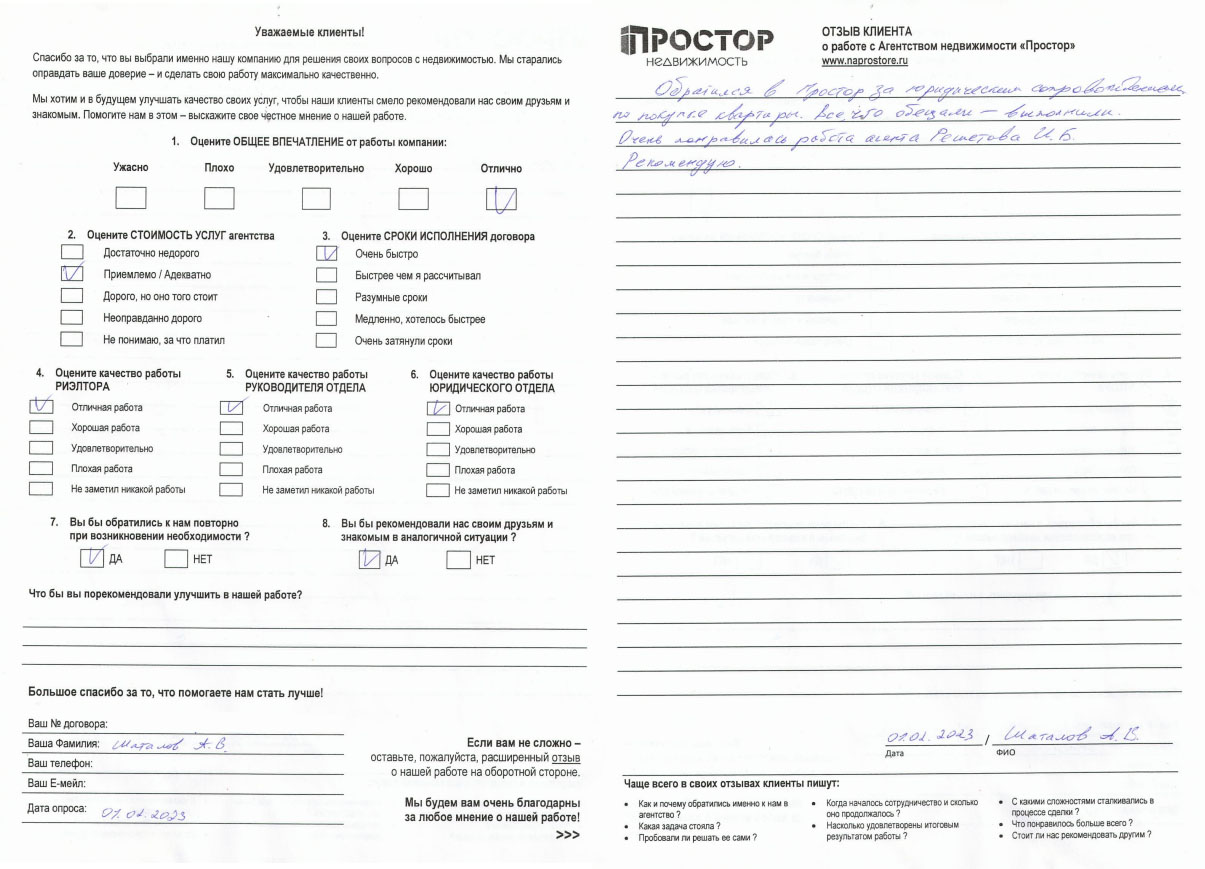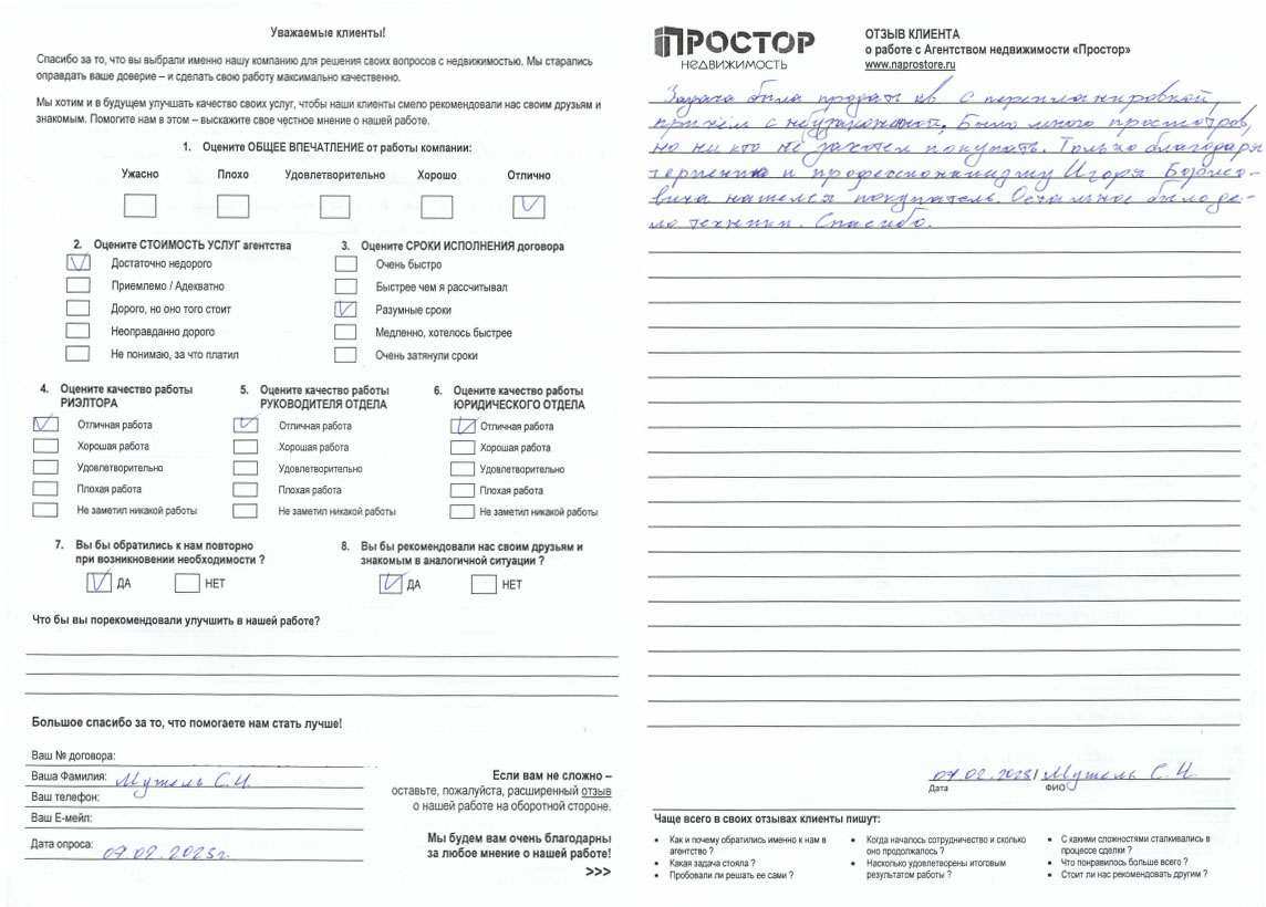КлиентХочу выразить искреннюю благодарность риэлтору Игорю Борисовичу Решетову за профессионализм и внимательное отношение на всех этапах сделки с недвижимостью. С самого начала нашего сотрудничества Игорь Борисович проявил себя как компетентный специалист, обладающий глубокими знаниями рынка недвижимости. Особо хочу отметить индивидуальный подход и внимание к деталям. Игорь Борисович всегда был на связи, предоставляя полную информацию и помогая принимать взвешенные решения на каждом этапе. Благодаря слаженной работе всей команды агентства "Простор", сделка вопреки всем сложившимся ситуациям по стране (по понятным причинам на момент 12.2025 г.) прошла, была проведена быстро и без лишних хлопот. Все документы были тщательно проверены, юридическая чистота сделки гарантирована. Рекомендую АН "Простор" и риэлтора Игоря Борисовича Решетова. Спасибо за Вашу работу и профессионализм.