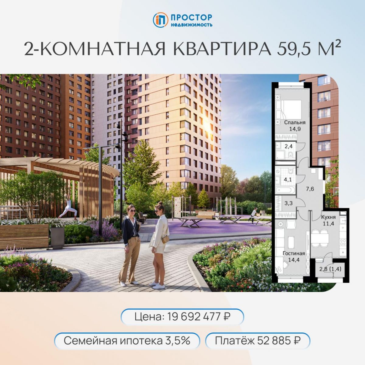 ✅ 2-комнатная 59,5 м²