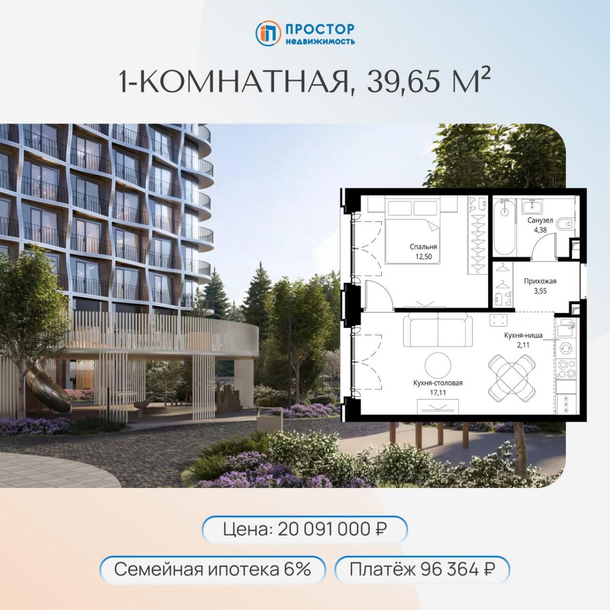 ✅ 1-комнатная 39,65 м²