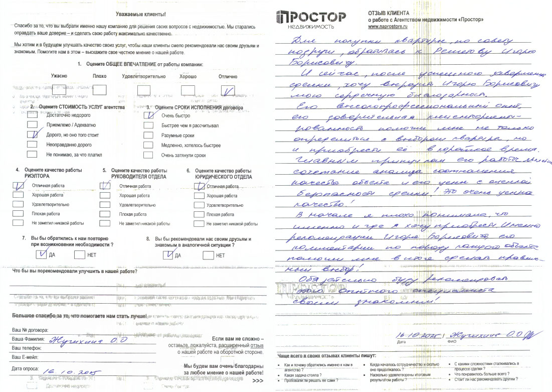 ПокупательХочу выразить благодарность компании АН Простор и риэлтору Игорю Борисовичу Решетову за предоставление услуги. Квартира, о которой я долго мечтала, с его помощью нашлась! Искренне рада тому, что это произошло очень быстро. Именно место расположения и даже планировка квартиры совпали с моими ожиданиями. Я творческая личность и для меня очень важны были факторы, которые я в итоге получила! Очень понравилось мне, что я оказалась в Просторе, вернее в своем просторе мечты. И все сложилось удачно! Сделка прошла удачно и быстро. Благодарю Вас за Ваше отношение, как человеческое, так и профессиональное.
