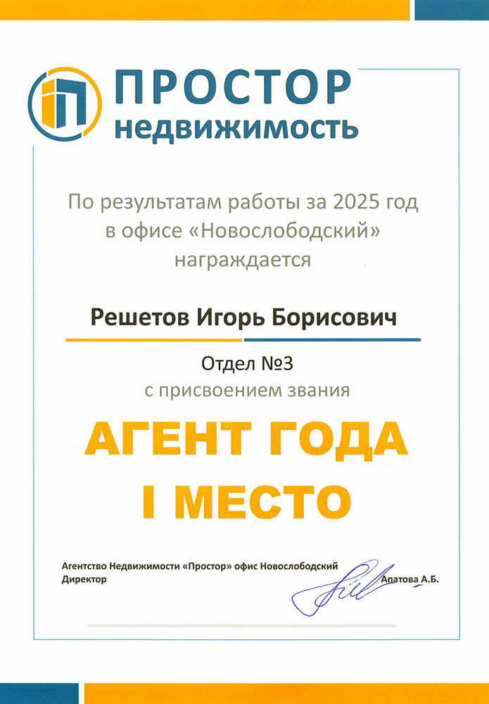 КлиентХочу выразить искреннюю благодарность риэлтору Игорю Борисовичу Решетову за профессионализм и внимательное отношение на всех этапах сделки с недвижимостью. С самого начала нашего сотрудничества Игорь Борисович проявил себя как компетентный специалист, обладающий глубокими знаниями рынка недвижимости. Особо хочу отметить индивидуальный подход и внимание к деталям. Игорь Борисович всегда был на связи, предоставляя полную информацию и помогая принимать взвешенные решения на каждом этапе. Благодаря слаженной работе всей команды агентства "Простор", сделка вопреки всем сложившимся ситуациям по стране (по понятным причинам на момент 12.2025 г.) прошла, была проведена быстро и без лишних хлопот. Все документы были тщательно проверены, юридическая чистота сделки гарантирована. Рекомендую АН "Простор" и риэлтора Игоря Борисовича Решетова. Спасибо за Вашу работу и профессионализм.
