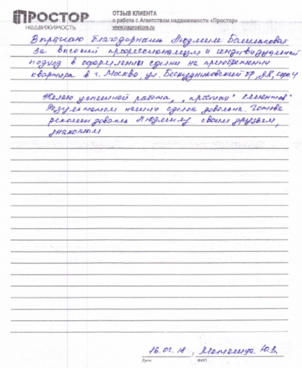 покупательВыражаю благодарность Людмиле Башлыковой за высокий профессионализм и индивидуальный подход в оформлении сделки на приобретение квартиры в г. Москва, ул. Бескудниковский б-р, д.8, корп.4. Желаю успешной работы, "простых" клиентов. Результатом наших сделок довольна. Готова рекомендовать Людмилу своим друзьям, знакомым.