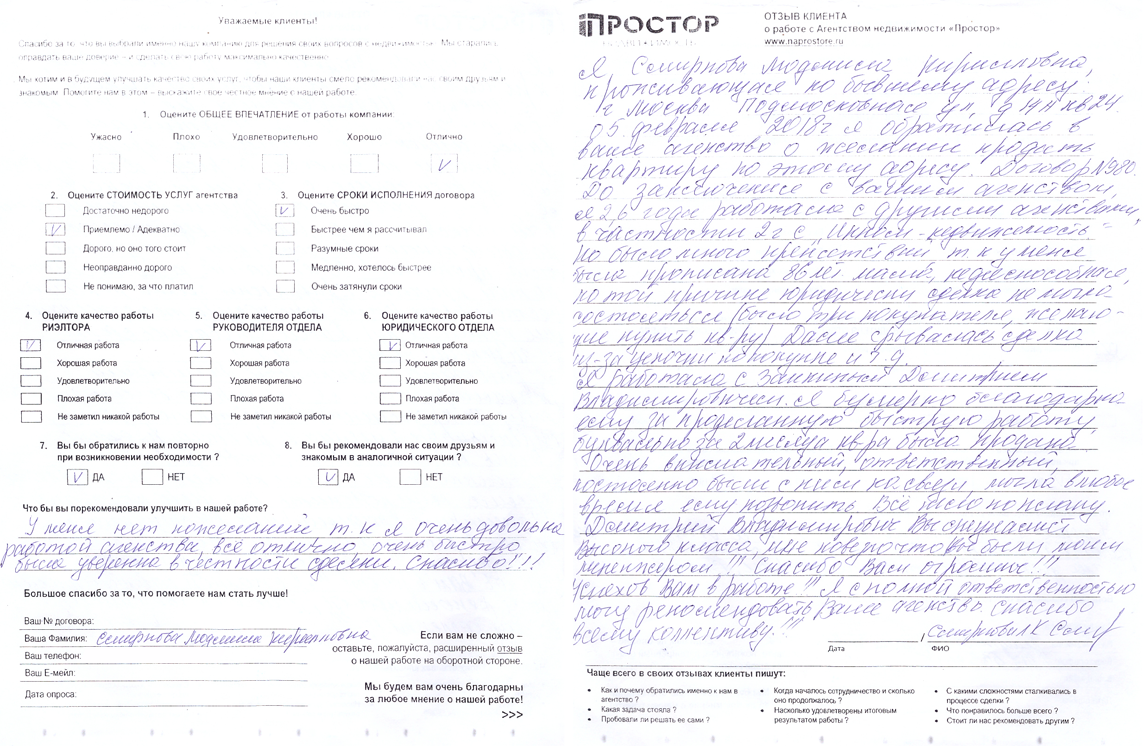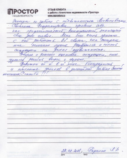 КлиентОт лица нашего агентства недвижимости выражаем искреннюю благодарность агенту компании «Простор» Монахову Вячеславу за высокопрофессиональную работу в рамках совместной сделки. Вячеслав продемонстрировал исключительный уровень компетентности и вовлечённости на всех этапах сотрудничества. Особенно хочется отметить: чёткую и оперативную организацию рабочего процесса; внимательное отношение к деталям и требованиям сторон; своевременную подготовку и передачу запрашиваемых документов от Продавца — в том числе при неоднократных обращениях со стороны банка. Работа с Вячеславом оставила исключительно положительное впечатление. Его подход к делу, ответственность и профессионализм служат отличным примером для коллег и подтверждают высокий уровень сервиса АН «Простор». Желаем Вячеславу дальнейших успехов, лёгких и выгодных сделок, а также благодарных Клиентов. Будем рады продолжить сотрудничество!