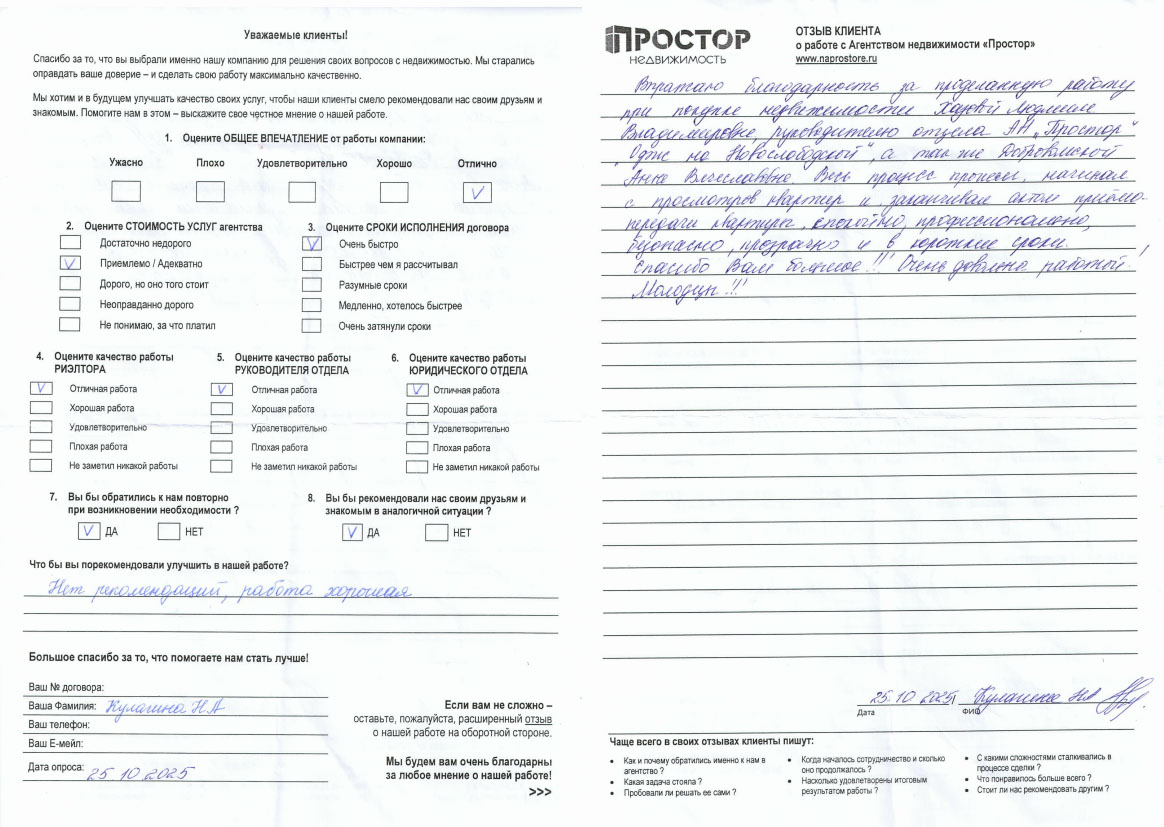 ПокупательВыражаю благодарность за проделанную работу при покупке недвижимости Хазовой Людмиле Владимировне, руководителю отдела АН «Простор» «Офис на Новослободской», а также Добровольской Анне Вячеславовне. Весь процесс прошел, начиная с просмотра квартиры, спокойно, профессионально, безопасно, прозрачно и в короткие сроки. Спасибо Вам большое!!! Очень довольны работой! Молодцы!!!