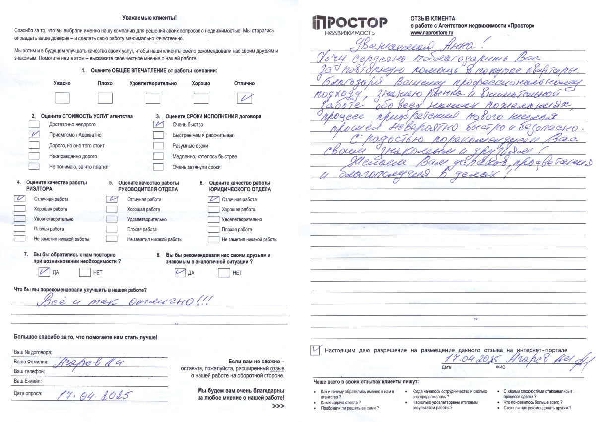 КлиентХочу выразить благодарность за профессиональную работу! Сделка прошла успешно во многом благодаря ответственному подходу риелтора к каждому этапу. С первых дней сотрудничества было понятно, что работаю с настоящим профессионалом. Все встречи и звонки — строго по графику, ни одной задержки или забытой договоренности. Такая обязательность редко встречается и очень ценится. Особо отмечу глубокое знание всех аспектов сделки — от юридических тонкостей до рыночной ситуации. На любой мой вопрос получал исчерпывающий ответ, причем с конкретными примерами и рекомендациями. Чувствовалось, что человек действительно разбирается в своем деле. Рекомендую как надежного специалиста, на которого можно положиться в таком важном деле, как покупка/продажа недвижимости.