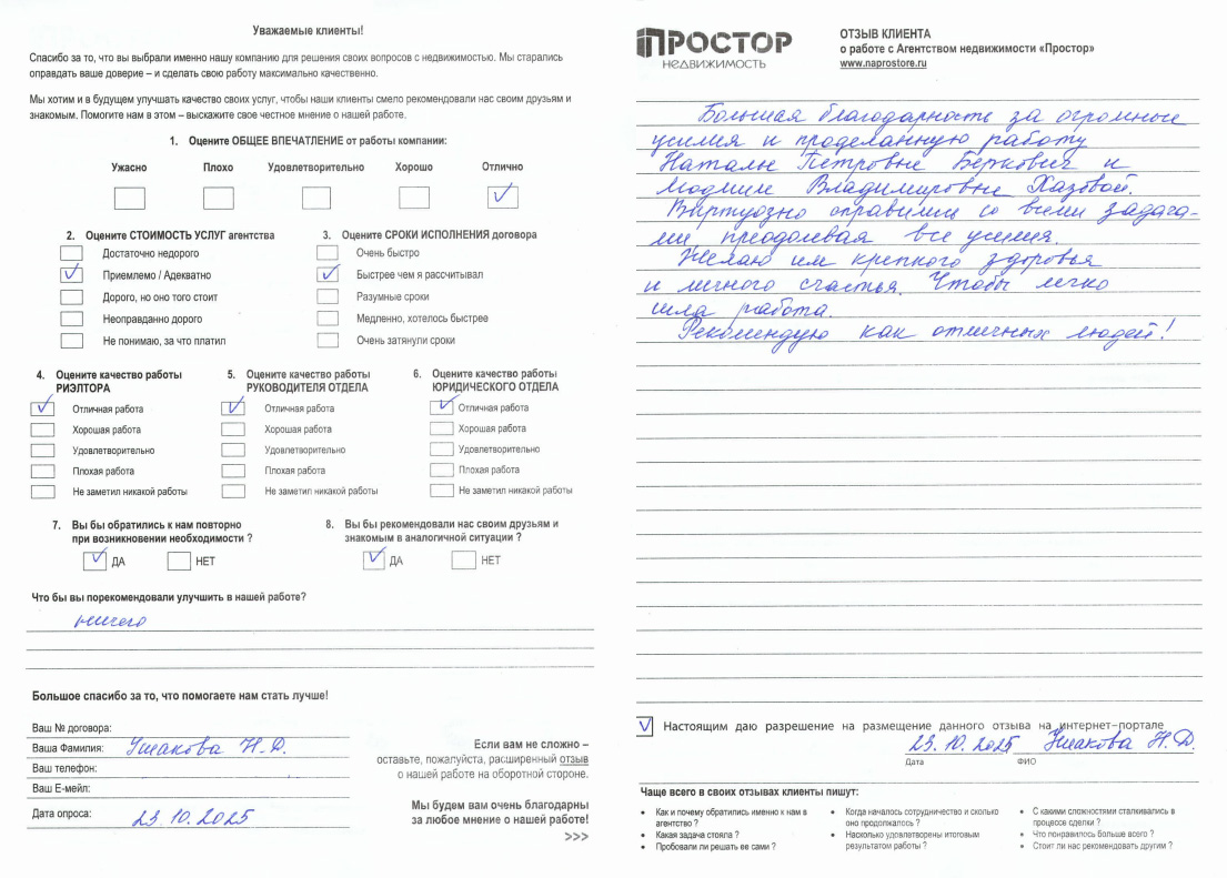 ПокупательРаботали с агентством Простор и риэлтором Натальей Разумцевой при покупке квартиры. Наталья - настоящий профессионал! С первой встречи до завершения сделки чувствовалась её поддержка и компетентность. Она всегда была на связи, отвечала на все наши вопросы и помогала с документами. Благодаря её усилиям, процесс покупки прошёл максимально быстро и гладко. Особенно понравилось, что Наталья учитывала все наши пожелания и предложила несколько отличных вариантов. Очень довольны работой с ней и агентством Простор. Рекомендуем всем!